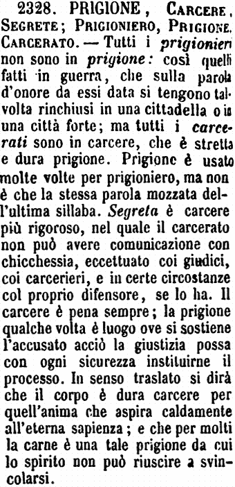 | Prigione, Carcere, Segrete; Prigioniero, Prigione, Carcerato - Tutti i prigionieri non sono in prigione: così quelli fatti in guerra, che sulla parola d'onore da essi data si tengono talvolta rinchiusi in una cittadella o in una città forte; ma tutti i carcerati sono in carcere, che è stretta e dura prigione. Prigione è usato molte volte per prigioniero, ma non è che la stessa parola mozzata dell'ultima sillaba. Segreta è carcere più rigoroso, nel quale il carcerato non può avere comunicazione con chicchessia, eccettuato coi giudici, coi carcerieri, e in certe circostanze col proprio difensore, se lo ha. Il carcere è pena sempre; la prigione qualche volta è luogo ove si sostiene l'accusato acciò la giustizia possa con ogni sicurezza istituirne il processo. In senso traslato si dirà che il corpo è dura carcere per quell'anima che aspira caldamente all'eterna sapienza; e che per molti la carne è una tale prigione da cui lo spirito non può riuscire a svincolarsi. [immagine] |