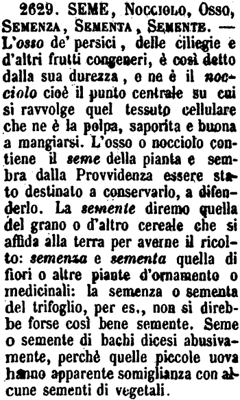 | Seme, Nocciolo, Osso, Semenza, Sementa, Semente - L'osso de' persici, delle ciliegie e d'altri frutti congeneri, è così detto dalla sua durezza, e ne è il nocciolo cioè il punto centrale su cui si ravvolge quel tessuto cellulare che ne è la polpa, saporita e buona a mangiarsi. L'osso o nocciolo contiene il seme della pianta e sembra dalla Provvidenza essere stato destinato a conservarlo, a difenderlo. La semente diremo quella del grano o d'altro cereale che si affida alla terra per averne il ricolto: semenza e sementa quella di fiori o altre piante d'ornamento o medicinali: la semenza o sementa del trifoglio, per es., non si direbbe forse così bene semente. Seme o semente di bachi dicesi abusivamente, perchè quelle piccole uova hanno apparente somiglianza con alcune sementi di vegetali. [immagine] |