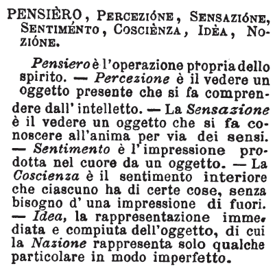 | Pensiero, Percezione, Sensazione, Sentimento, Coscienza, Idea, Nozione - Pensiero è l'operazione propria dello spirito. - Percezione è il vedere un oggetto presente che si fa comprendere dall'intelletto. - La Sensazione è il vedere un oggetto che si fa conoscere all'anima per via dei sensi. - Sentimento è l'impressione prodotta nel cuore da un oggetto. - La Coscienza è il sentimento interiore che ciascuno ha di certe cose, senza bisogno d'una impressione di fuori. - Idea, la rappresentazione immediata e compiuta dell'oggetto, di cui la Nazione rappresenta solo qualche particolare in modo imperfetto. [immagine] |