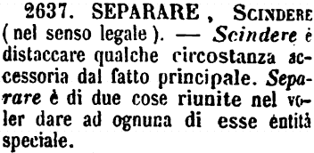 | Separare, Scindere (nel senso legale) - Scindere è distaccare qualche circostanza accessoria dal fatto principale. Separare è di due cose riunite nel voler dare ad ognuna di esse entità speciale [immagine] |