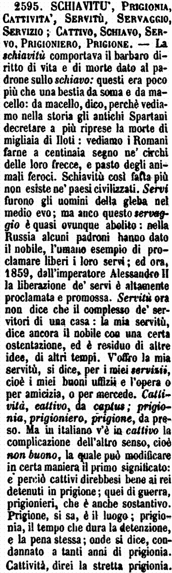 | Schiavitù, Prigionia, Cattività, Servitù, Servaggio, Servizio; Cattivo, Schiavo, Servo, Prigioniero, Prigione - La schiavitù comportava il barbaro diritto di vita e di morte dato al padrone sullo schiavo: questi era poco più che una bestia da soma e da macello: da macello, dico, perchè vediamo nella storia gli antichi Spartani decretare a più riprese la morte di migliaia di Iloti: vediamo i Romani farne a centinaia segno ne' circhi delle loro frecce, e pasto degli animali feroci. Schiavitù così fatta più non esiste ne' paesi civilizzati. Servi furono gli uomini della gleba nel medio evo; ma anco questo servaggio è quasi ovunque abolito: nella Russia alcuni padroni hanno dato il nobile, l'umano esempio di proclamare liberi i loro servi; ed ora, 1859, dall'imperatore Alessandro II la liberazione de' servi è altamente proclamata e promossa. Servitù ora non dice che il complesso de' servitori di una casa: la mia servitù, dice ancora il nobile con una certa ostentazione, ed è residuo di altre idee, di altri tempi. V'offro la mia servitù, si dice, per i miei servizii, cioè i miei buoni uffizii e l'opera o per amicizia, o per mercede. Cattività, cattivo, da captus; prigionia, prigioniero, prigione, da preso. Ma in italiano v'è in cattivo la complicazione dell'altro senso, cioè non buono, la quale può modificare in certa maniera il primo significato: e perciò cattivi direbbesi bene ai rei detenuti in prigione; quei di guerra, prigionieri, che è anche sostantivo. Prigione, si sa, è il luogo; prigionia, il tempo che dura la detenzione, e la pena stessa; onde si dice, condannato a tanti anni di prigionia. Cattività, direi la stretta prigionia. [immagine] |