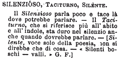 | Silenzioso, Taciturno, Silente - Il Silenzioso parla poco e tace là dove potrebbe parlare. - Il Taciturno, che si riferisce più all'abito e all'indole, sta duro nel silenzio anche quando dovrebbe parlare. - [Silente, voce solo della poesia, non si direbbe che di cosa. - «Silenti boschi - valli.» G. F.] [immagine] |