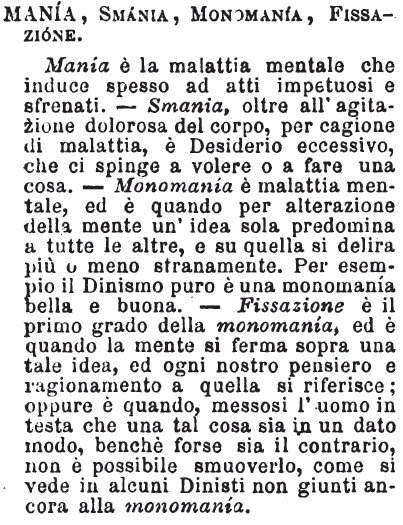 | Mania, Smania, Monomania, Fissazione - Mania è la malattia mentale che induce spesso ad atti impetuosi e sfrenati. - Smania, oltre all'agitazione dolorosa del corpo, per cagione di malattia, è Desiderio eccessivo, che ci spinge a volere o a fare una cosa. - Monomania è malattia mentale, ed è quando per alterazione della mente un'idea sola predomina a tutte le altre, e su quella si delira più o meno stranamente. Per esempio il Dinismo puro è una monomania bella e buona. - Fissazione è il primo grado della monomania, ed è quando la mente si ferma sopra una tale idea, ed ogni nostro pensiero e ragionamento a quella si riferisce; oppure è quando, messosi l'uomo in testa che una tal cosa sia in un dato modo, benchè forse sia il contrario, non è possibile smuoverlo, come si vede in alcuni Dinisti non giunti ancora alla monomania. [immagine] |