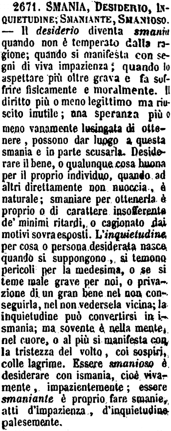 | Smania, Desiderio, Inquietudine; Smaniante, Smanioso - Il desiderio diventa smania quando non è temperato dalla ragione; quando si manifesta con segni di viva impazienza; quando lo aspettare più oltre grava e fa soffrire fisicamente e moralmente. Il diritto più o meno legittimo ma riuscito inutile; una speranza più o meno vanamente lusingata di ottenere, possono dar luogo a questa smania e in parte scusarla. Desiderare il bene, o qualunque cosa buona per il proprio individuo, quando ad altri direttamente non nuoccia, è naturale; smaniare per ottenerla è proprio o di carattere insofferente de' minimi ritardi, o cagionato dai motivi sovra esposti. L'inquietudine per cosa o persona desiderata nasce quando si suppongono, si temono pericoli per la medesima, o se si teme male grave per noi, o privazione di un gran bene nel non conseguirla, nel non vedersela vicina; la inquietudine può convertirsi in ismania; ma sovente è nella mente, nel cuore, o al più si manifesta con la tristezza del volto, coi sospiri, colle lagrime. Essere smanioso è desiderare con ismania, cioè vivamente, impazientemente; essere smaniante è proprio fare smanie, atti d'impazienza, d'inquietudine palesemente. [immagine] |
