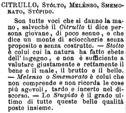 | Citrullo, Stolto, Melenso, Smemorato, Stupido - Son tutte voci che si danno la mano, salvochè il Citrullo ti dice persona giovane, di poco senno, e che dice un monte di scioccherie senza proposito e senza costrutto. - Stolto è colui cui la natura ha fatto ebete dell'ingegno, e non è sufficiente a valutare giustamente e rettamente il bene e il male, il brutto e il bello. - Melenso o Smemorato è colui che non comprende e non ricorda le cose più agevoli, tardo e incerto nel discorso. - Lo Stupido è il grado ultimo di tutte queste belle qualità poste insieme. [immagine] |