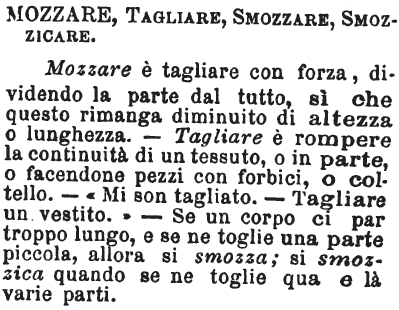 | Mozzare, Tagliare, Smozzare, Smozzicare - Mozzare è tagliare con forza, dividendo la parte dal tutto, sì che questo rimanga diminuito di altezza o lunghezza. - Tagliare è rompere la continuità di un tessuto, o in parte, o facendone pezzi con forbici, o coltello. - «Mi son tagliato. - Tagliare un vestito.» - Se un corpo ci par troppo lungo, e se ne toglie una parte piccola, allora si smozza; si smozzica quando se ne toglie qua e là varie parti. [immagine] |