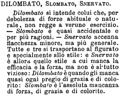Dilombato, Slombato, Snervato - Dilombato si intende colui che, per debolezza di forze abituale o naturale, non regge a veruno esercizio. - Slombato è quasi accidentale e per più ragioni. - Snervato accenna fiacchezza minore, ma più generale. Tutte e tre si trasportano al figurato e specialmente allo stile: e Snervato è allora quello stile a cui manca la efficacia e la forza, ma non è al tutto vizioso: Dilombato è quando gli manca quasi ogni pregio di grazia e di colorito: Slombato è l'assoluta mancanza di forza, di grazia e di colorito. [immagine]