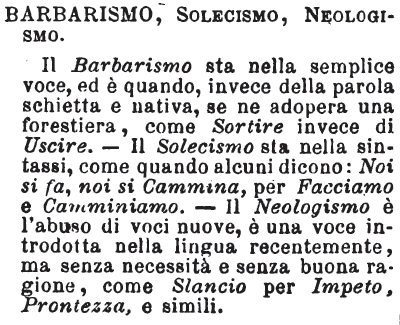 | Barbarismo, Solecismo, Neologismo - Il Barbarismo sta nella semplice voce, ed è quando, invece della parola schietta e nativa, se ne adopera una forestiera, come Sortire invece di Uscire. - Il Solecismo sta nella sintassi, come quando alcuni dicono: Noi si fa, noi si Cammina, per Facciamo e Camminiamo. - Il Neologismo è l'abuso di voci nuove, è una voce introdotta nella lingua recentemente, ma senza necessità e senza buona ragione, come Slancio per Impeto, Prontezza, e simili. [immagine] |