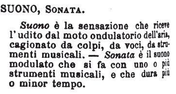 | Suono, Sonata - Suono è la sensazione che riceve l'udito dal moto ondulatorio dell'aria, cagionato da colpi, da voci, da strumenti musicali. - Sonata è il suono modulato che si fa con uno o più strumenti musicali, e che dura più o minor tempo. [immagine] |