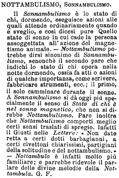 | Nottambulismo, Sonnambulismo - Il Sonnambulismo è lo stato di chi, dormendo, eseguisce azioni alle quali attende ordinariamente quando è sveglio, e così dicesi pure Quello stato di sonno in cui cade la persona assoggettata all'azione del magnetismo animale. - Nottambulismo potrebbe dirsi sinonimo di Sonnambulismo, senonchè il secondo pare che indichi lo stato di chi opera nella notte dormendo, ossia fa atti o azioni di qualche importanza, come scrivere, fabbricare strumenti, ecc.; il primo, il solo camminare durante il sonno. A Sonnambulismo si dà oggi più specialmente il senso di Stato di chi è nel sonno magnetico, che non si direbbe Nottambulismo. Pare inoltre che Nottambulismo comporti meglio certi sensi traslati di spregio. Infatti il Giusti nelle Lettere: «Non date retta a certi dotti barbagianni, a certi civettoni chiarissimi, partigiani della solitudine e del nottambulismo.» - Nottambulo è infatti molto più familiare; e parrebbe ridevole il parlare delle divine melodie della Nottambula. G. F. [immagine] |