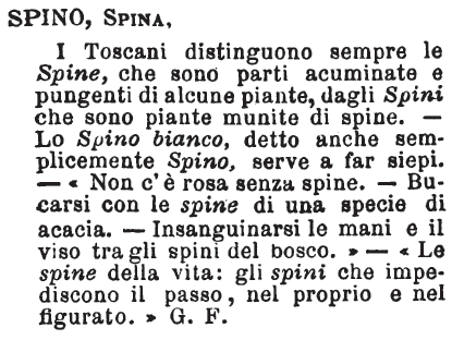Spino, Spina - I Toscani distinguono sempre le Spine, che sono parti acuminate e pungenti di alcune piante, dagli Spini che sono piante munite di spine. - Lo Spino bianco, detto anche semplicemente Spino, serve a far siepi. - «Non c'è rosa senza spine. - Bucarsi con le spine di una specie di acacia. - Insanguinarsi le mani e il viso tra gli spini del bosco.» - «Le spine della vita: gli spini che impediscono il passo, nel proprio e nel figurato.» G. F. [immagine]