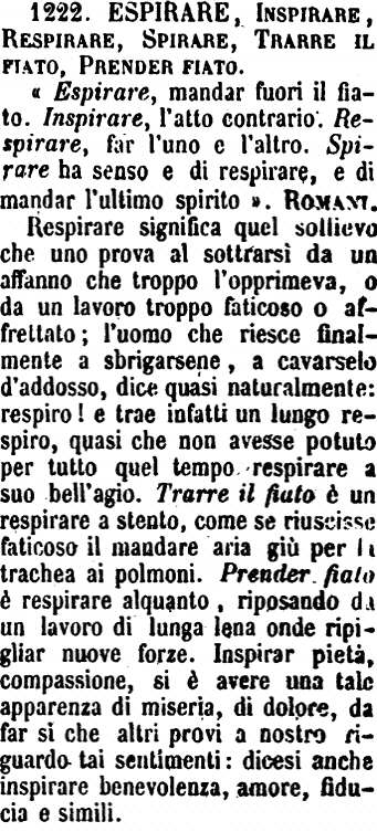 Espirare, Inspirare, Respirare, Spirare, Trarre il fiato, Prender fiato - «Espirare, mandar fuori il fiato. Inspirare, l'atto contrario. Respirare, far l'uno e l'altro. Spirare ha senso e di respirare, e di mandar l'ultimo spirito». Romani.