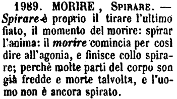 | Morire, Spirare - Spirare è proprio il tirare l'ultimo fiato, il momento del morire: spirar l'anima: il morire comincia per così dire all'agonia, e finisce collo spirare; perchè molte parti del corpo son già fredde e morte talvolta, e l'uomo non è ancora spirato. [immagine] |