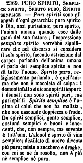 | Puro spirito, Semplice spirito, Spirito puro, Spirito semplice - Puri spiriti sono gli angeli d'ogni gerarchia: puro spirito è Dio, anzi purissimo: puro spirito, l'anima umana quando esce dalle mani del suo fattore; l'espressione semplice spirito vorrebbe significare che nel discorso si considera il solo spirito, facendo astrazione dal corpo: parlando dell'anima umana si parla del semplice spirito e non di tutto l'uomo. Spirito puro, religiosamente parlando, è quell'anima che non è macolata di colpa: i demoni infatto si dicono spiriti impuri; i dannati non sono spiriti puri, ma puri spiriti. Spirito semplice è l'anima di colui che non ha malizia, che non nasconde doppiezza o frode. Da spiriti semplici, gente semplice, costumi semplici e buoni e innocenti, che, non sempre, ma sovente è tutt'uno. L'alcool è spirito di vino semplice; distillato di nuovo diventa più puro; misto a zucchero e droghe, con cui se ne fa rosolio, non è più nè semplice nè puro. [immagine] |