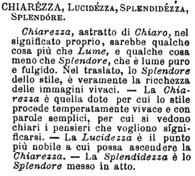 | Chiarezza, Lucidezza, Splendidezza, Splendore - Chiarezza, astratto di Chiaro, nel significato proprio, sarebbe qualche cosa più che Lume, e qualche cosa meno che Splendore, che è lume puro e fulgido. Nel traslato, lo Splendore dello stile, è veramente la ricchezza delle immagini vivaci. - La Chiarezza è quella dote per cui lo stile procede temperatamente vivace e con parole semplici, per cui si vedono chiari i pensieri che vogliono significarsi. - La Lucidezza è il punto più nobile a cui possa ascendere la Chiarezza. - La Splendidezza è lo Splendore messo in atto. [immagine] |