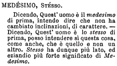 | Medesimo, Stesso - Dicendo quest'uomo è il medesimo di prima, intendo dire che non ha cambiato inclinazioni, carattere; dicendo, quest'uomo è lo stesso di prima, posso intendere sì questa cosa, come anche, che è quello e non un altro: stesso ha dunque più lato, ed eziandio più forte significato di medesimo. [immagine] |