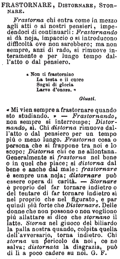 «Non ti frastornino La testa e il cuore Sogni di gloria Larve d'onore.» Giusti. «Mi vien sempre a frastornare quando sto studiando.» - Frastornando, non sempre si interrompe; Distornando, sì. Chi distorna rimuove dall'atto o dal pensiero per un tempo più o meno lungo. Frastorna cosa o persona che si frappone tra noi e lo scopo: Distorna chi ce ne allontana. Generalmente si frastorna nel bene o in quel che piace; si distorna dal bene e anche dal male: frastornare è sempre una noja; distornare può essere opera di carità. - Stornare è proprio del far tornare indietro o del tentare di far tornare indietro si nel proprio che nel figurato, e par quindi più forte che Distornare. Delle donne che non possono o non vogliono più allattare si dice che stornano il latte. Storna nel giuoco del biliardo la palla nostra quando, colpita quella dell'avversario, torna indietro. Chi storna un pericolo da noi, ce ne salva; distornata la disgrazia, può di lì a poco cadere su noi. G. F. [immagine] |