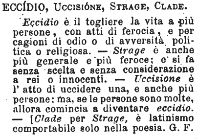 | Eccidio, Uccisione, Strage, Clade - Eccidio è il togliere la vita a più persone, con atti di ferocia, e per cagioni di odio o di avversità politica o religiosa. - Strage è anche più generale e più feroce; e si fa senza scelta e senza considerazione a rei o innocenti. - Uccisione è l'atto di uccidere una, e anche più persone; ma, se le persone sono molte, allora comincia a diventare eccidio. - [Clade per Strage, è latinismo comportabile solo nella poesia. G. F. [immagine] |