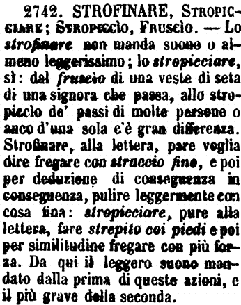 | Strofinare, Stropicciare; Stropeccìo, Fruscìo - Lo strofinare non manda suono o almeno leggerissimo; lo stropicciare, sì: dal fruscio di una veste di seta di una signora che passa, allo stropiccìo de' passi di molte persone o anco d'una sola c'è gran differenza. Strofinare, alla lettera, pare voglia dire fregare con straccio fino, e poi per deduzione di conseguenza in conseguenza, pulire leggermente con cosa fina: stropicciare, pure alla lettera, fare strepito coi piedi e poi per similitudine fregare con più forza. Da qui il leggero suono mandato dalla prima di queste azioni, e il più grave della seconda. [immagine] |