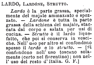 | Lardo, Lardone, Strutto - Lardo è la parte grassa, specialmente del majale ammazzato e spezzato. - Lardone è tutta la parte grassa della schiena del majale, staccata dal corpo e salata per usi di cucina. - Strutto è il lardo liquefatto, che poi si conserva in vesciche. Nell'uso per altro si confondono spesso il lardo e lo strutto. - [Si confondono nell'uso toscano solamente (certo nel fiorentino); non nell'uso del resto d'Italia. G. F.] [immagine] |