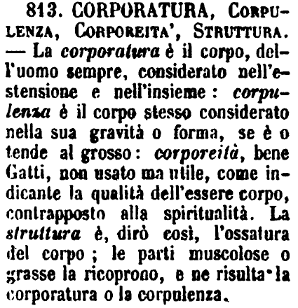 | Corporatura, Corpulenza, Corporeità, Struttura - La corporatura è il corpo, dell'uomo sempre, considerato nell'estensione e nell'insieme: corpulenza è il corpo stesso considerato nella sua gravità o forma, se è o tende al grosso: corporeità, bene Gatti, non usato ma utile, come indicante la qualità dell'essere corpo, contrapposto alla spiritualità. La struttura è, dirò così, l'ossatura del corpo; le parti muscolose o grasse la ricoprono, e ne risulta la corporatura o la corpulenza. [immagine] |