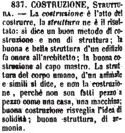 | Costruzione, Struttura - La costruzione è l'atto del costrurre, la struttura ne è il risultato: si dice un buon metodo di costruzione e non di struttura; la buona e bella struttura d'un edifizio fa onore all'architetto; la buona costruzione al capo mastro. La struttura del corpo umano, d'un animale e simili si dice, e non la costruzione, perchè non son fatti pezzo a pezzo come una casa, una macchina; buona costruzione risveglia l'idea di solidità; buona struttura, di armonia. [immagine] |