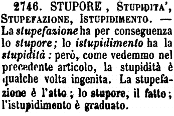 | Stupore, Stupidità, Stupefazione, Istupidimento - La stupefazione ha per conseguenza lo stupore; lo istupidimento ha la stupidità; però, come vedemmo nel precedente articolo, la stupidità è qualche volta ingenita. La stupefazione è l'alto; lo stupore, il fatto; l'istupidimento è graduato. [immagine] |