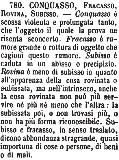 | Conquasso, Fracasso, Rovina, Subisso - Conquasso è scossa violenta e prolungata tanto, che l'oggetto il quale la prova ne risenta sconcerto. Fracasso è rumore grande o rottura di oggetto che cagioni questo rumore. Subisso è caduta in un abisso o precipizio. Rovina è meno di subisso in quanto all'apparenza della cosa rovinata o subissata, ma nell'intrinseco, anche la cosa rovinata non può più servire nè più nè meno che l'altra: la subissata poi, o non trovasi più, o non ha più forma riconoscibile. Subisso e fracasso, in senso traslato, dicono abbondanza stragrande, quasi importuna di cose o persone, di beni o di mali. [immagine] |