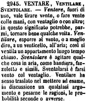 | Ventare, Ventilare, Sventolare - Ventare, fuori di uso, vale tirare vento, o fare vento colle mani, con ventaglio o con altro; in questo significato potrebbe, parmi, tornare bene qualche volta. Ventilare, esporre al vento, o a meglio dire, a un venticello, all'aria; così si ventila un appartamento lungo tempo chiuso. Sventolare è agitare qualche cosa in aria, come bandiera, fazzoletto e simili. Sventolarsi è farsi vento col ventaglio. Ventilare ha senso traslato nel mettere ad esame, in discussione un qualsiasi argomento e pesarne le ragioni, le probabilità seconde o avverse. [immagine] |