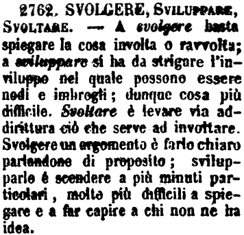 | Svolgere, Sviluppare, Svoltare - A svolgere basta spiegare la cosa involta o ravvolta; a sviluppare si ha da strigare l'inviluppo nel quale possono essere nodi e imbrogli; dunque cosa più difficile. Svoltare è levare via addirittura ciò che serve ad involtare. Svolgere un argomento è farlo chiaro parlandone di proposito; svilupparlo è scendere a più minuti particolari, molto più difficili a spiegare e a far capire a chi non ne ha idea. [immagine] |