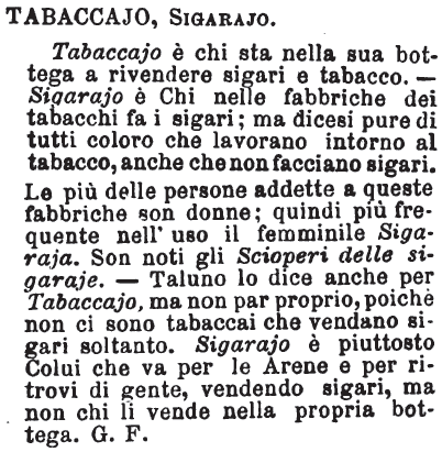 | Tabaccajo, Sigarajo - Tabaccajo è chi sta nella sua bottega a rivendere sigari e tabacco. - Sigarajo è Chi nelle fabbriche dei tabacchi fa i sigari; ma dicesi pure di tutti coloro che lavorano intorno al tabacco, anche che non facciano sigari. Le più delle persone addette a queste fabbriche son donne; quindi più frequente nell'uso il femminile Sigaraja. Son noti gli Scioperi delle sigaraje. - Taluno lo dice anche per Tabaccajo, ma non par proprio, poichè non ci sono tabaccai che vendano sigari soltanto. Sigarajo è piuttosto Colui che va per le Arene e per ritrovi di gente, vendendo sigari, ma non chi li vende nella propria bottega. G. F. [immagine] |