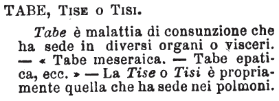 | Tabe, Tise o Tisi - Tabe è malattia di consunzione che ha sede in diversi organi o visceri. - «Tabe meseraica. - Tabe epatica, ecc.» - La Tise o Tisi è propriamente quella che ha sede nei polmoni. [immagine] |