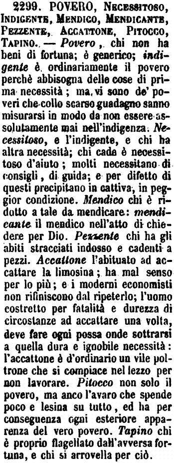 | Povero, Necessitoso, Indigente, Mendico, Mendicante, Pezzente, Accattone, Pitocco, Tapino - Povero, chi non ha beni di fortuna; è generico; indigente è ordinariamente il povero perchè abbisogna delle cose di prima necessità; ma vi sono de' poveri che collo scarso guadagno sanno misurarsi in modo da non essere assolutamente mai nell'indigenza. Necessitoso, e l'indigente, e chi ha altra necessità; chi cade è necessitoso d'aiuto; molti necessitano di consigli, di guida; e per difetto di questi precipitano in cattiva, in peggior condizione. Mendico chi è ridotto a tale da mendicare: mendicante il mendico nell'atto di chiedere per Dio. Pezzente chi ha gli abiti stracciati indosso e cadenti a pezzi. Accattone l'abituato ad accattare la limosina; ha mal senso per lo più; e i moderni economisti non rifiniscono dal ripeterlo; l'uomo costretto per fatalità e durezza di circostanze ad accattare una volta, deve fare ogni possa onde sottrarsi a quella dura e ignobile necessità: l'accattone è d'ordinario un vile poltrone che si compiace nel lezzo per non lavorare. Pitocco non solo il povero, ma anco l'avaro che spende poco e lesina su tutto, ed ha per conseguenza ogni esteriore apparenza del vero povero. Tapino chi è proprio flagellato dall'avversa fortuna, e chi si arrovella per ciò. [immagine] |