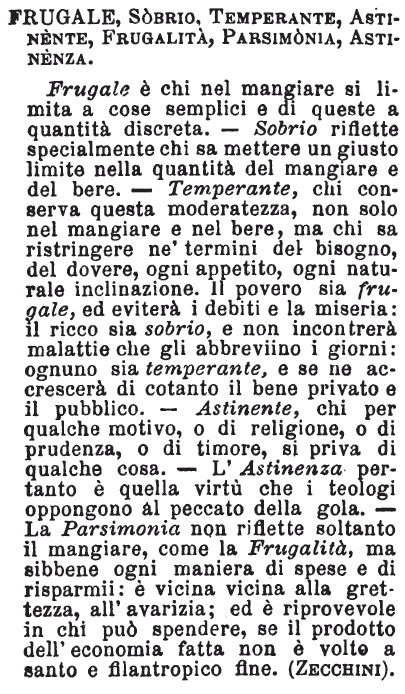| Frugale, Sobrio, Temperante, Astinente; Frugalità, Parsimonia, Astinenza - Frugale è chi nel mangiare si limita a cose semplici e di queste a quantità discreta. Sobrio riflette specialmente chi sa mettere un giusto limite nella quantità del mangiare e del bere. Temperante, chi conserva questa moderatezza non solo nel mangiare e nel bere; ma chi sa ristringere ne' termini del bisogno, del dovere ogni appetito, ogni naturale inclinazione. Il povero sia frugale ed eviterà i debiti e la miseria: il ricco sia sobrio, e non incontrerà malattie che gli abbreviino i giorni: ognuno sia temperante e se ne accrescerà di cotanto il bene privato e il pubblico. Astinente, che per qualche motivo o di religione, o di prudenza, o di timore si priva di qualche cosa: l'astinenza, pertanto è quella virtù che i teologi oppongono al peccato della gola. La parsimonia non riflette soltanto il mangiare, come la frugalità, ma sibbene ogni maniera di spese e di risparmii: è vicina vicina alla grettezza, all'avarizia; ed è riprovevole in chi può spendere, se il prodotto dell'economia fatta non è volto a santo e filantropico fine. [immagine] |