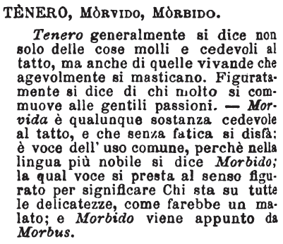 | Tenero, Morvido, Morbido - Tenero generalmente si dice non solo delle cose molli e cedevoli al tatto, ma anche di quelle vivande che agevolmente si masticano. Figuratamente si dice di chi molto si commuove alle gentili passioni. - Morvida è qualunque sostanza cedevole al tatto, e che senza fatica si disfà: è voce dell'uso comune, perchè nella lingua più nobile si dice Morbido; la qual voce si presta al senso figurato per significare Chi sta su tutte le delicatezze, come farebbe un malato; e Morbido viene appunto da Morbus. [immagine] |