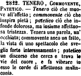 | Tenero, Commovente, Patetico - Tenero ciò che muove all'affetto; commovente ciò che inspira pietà; patetico ciò che infonde dolorosa, ma insieme affettuosa tristezza. Tenera una parola, un'occhiata; commovente anco un fatto, la vista di uno spettacolo che sveglia forte interessamento; patetico un discorso che cerca e trova le vie del cuore, e fa vibrare in esso le corde di affettuosa malinconia. [immagine] |