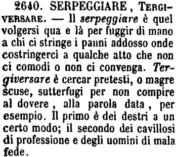 | Serpeggiare, Tergiversare - Il serpeggiare è quel volgersi qua e là per fuggir di mano a chi ci stringe i panni addosso onde costringerci a qualche atto che non ci comodi o non ci convenga. Tergiversare è cercar pretesti, o magre scuse, sotterfugi per non compire al dovere, alla parola data, per esempio. Il primo è dei destri a un certo modo; il secondo dei cavillosi di professione e degli uomini di mala fede. [immagine] |