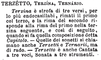 Terzetto, Terzina, Ternario - Terzina è strofa di tre versi, per lo più endecasillabi, rimati il primo col terzo, e la rima del secondo risponde alla rima del primo nella terzina seguente, e così di seguito, quando si fa quella composizione detta Capitolo. - Quelle dei sonetti si chiamano anche Terzetti e Ternarii, ma di rado. - Terzetto è anche Cantata a tre voci, Sonata a tre strumenti. [immagine]