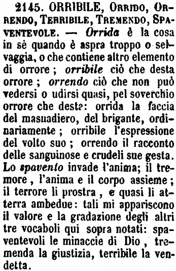 | Orribile, Orrido, Orrendo, Terribile, Tremendo, Spaventevole - Orrida è la cosa in sè quando è aspra troppo o selvaggia, o che contiene altro elemento di orrore; orribile ciò che desta orrore; orrendo ciò che non può vedersi o udirsi quasi, pel soverchio orrore che desta: orrida la faccia del masnadiero, del brigante, ordinariamente; orribile l'espressione del volto suo; orrendo il racconto delle sanguinose e crudeli sue gesta. Lo spavento invade l'anima; il tremore, l'anima e il corpo assieme; il terrore li prostra, e quasi li atterra ambedue: tali mi appariscono il valore e la gradazione degli altri tre vocaboli qui sopra notati: spaventevoli le minaccie di Dio, tremenda la giustizia, terribile la vendetta. [immagine] |
