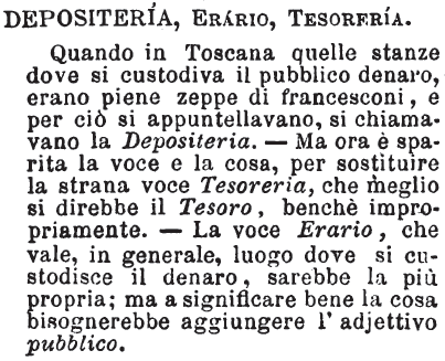 Depositeria, Erario, Tesoreria - Quando in Toscana quelle stanze dove si custodiva il pubblico denaro, erano piene zeppe di francesconi, e per ciò si appuntellavano, si chiamavano la Depositeria. - Ma ora è sparita la voce e la cosa, per sostituire la strana voce Tesoreria, che meglio si direbbe il Tesoro, benché impropriamente. - La voce Erario, che vale, in generale, luogo dove si custodisce il denaro, sarebbe la più propria; ma a significare bene la cosa bisognerebbe aggiungere l’adjettivo pubblico. [immagine]