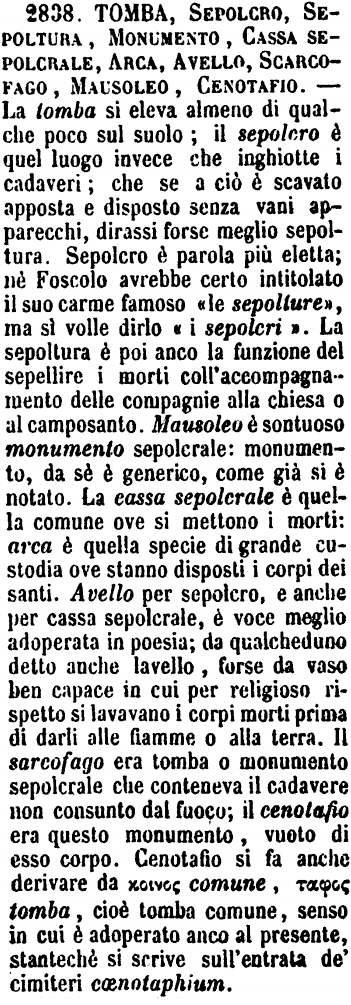| Cenotafio, Sepolcro, Tomba, Monumento, Sarcofago - Cenotafio è sepolcro vuoto, senza il corpo del morto, e fatto a pura onoranza; che se è ricco e adorno di opere d'arte, si dice Monumento; e quando poi è grandioso e solenne, diventa Mausoleo. - Nel Sepolcro giace il corpo o le ceneri. - Il Sarcofago è termine, più che altro, di archeologia, e si dice la cassa dove era chiuso il corpo morto. La voce suona mangiacarne, e fu detto a quel modo, perchè gli antichi li facevano di una pietra che si credeva consumare il morto corpo. - Tomba è voce generica di qualunque luogo dove corpi morti sieno seppelliti, e comprende tutti i nominati. [immagine] |