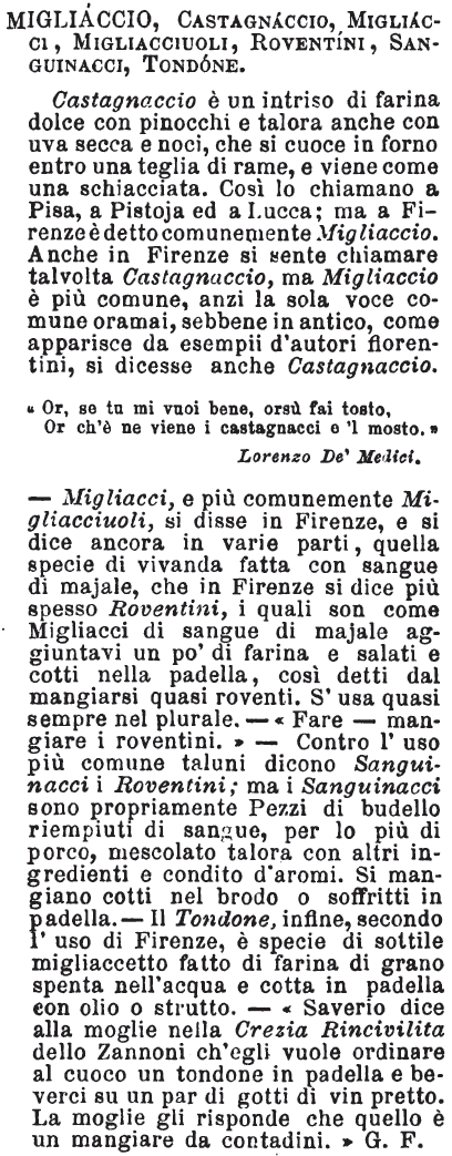 | Migliaccio, Castagnaccio, Migliacci, Migliacciuoli, Roventini, Sanguinacci, Tondone - Castagnaccio è un intriso di farina dolce con pinocchi e talora anche con uva secca e noci, che si cuoce in forno entro una teglia di rame, e viene come una schiacciata. Così lo chiamano a Pisa, a Pistoja ed a Lucca; ma a Firenze è detto comunemente Migliaccio. Anche in Firenze si sente chiamare talvolta Castagnaccio, ma Migliaccio è più comune, anzi la sola voce comune oramai, sebbene in antico, come apparisce da esempii d'autori fiorentini, si dicesse anche Castagnaccio.