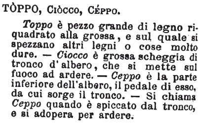 Toppo, Ciocco, Ceppo - Toppo è pezzo grande di legno riquadrato alla grossa, e sul quale si spezzano altri legni o cose molto dure. - Ciocco è grossa scheggia di tronco d'albero, che si mette sul fuoco ad ardere. - Ceppo è la parte inferiore dell'albero, il pedale di esso, da cui sorge il tronco. - Si chiama Ceppo quando è spiccato dal tronco, e si adopera per ardere. [immagine]