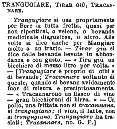 | Trangugiare, Tirar giù, Tracannare - Trangugiare si usa propriamente per Bere in tutta fretta, quasi per non ripentirsi, o veleno, o bevanda medicinale disgustosa, o altro. Alle volte si dice anche per Mangiare molto a un tratto. - Tirar giù si dice delle bevande bevute in abbondanza e con gusto. - « Tira giù un bicchiere di mezzo litro per volta. » - [Trangugiare è proprio di cibi e di bevande; Tracannare soltanto di queste, quando si bevano avidamente fuor di misura e precipitosamente. - « Tracannarono un fiasco di vino - gran bicchieroni di birra. » - Un pollo, una frittata non si tracannano, si trangugiano; il vino, il latte, non si trangugiano. Trangugiare ha traslati; Tracannare, no. G. F.] [immagine] |