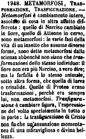 | Metamorfosi, Mutazione, Trasformazione - La Metamorfosi è cambiamento di forma maraviglioso o strano e senza apparente cagione.- Trasformazione è più semplice e più naturale, e generalmente se ne comprende la ragione.- Mutazione è il puro fatto considerato in sè stesso. [immagine] |