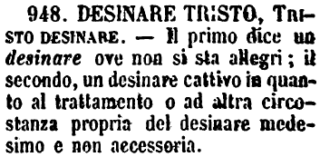 | Desinare tristo, Tristo desinare - Il primo dice un desinare ove non si sta allegri; il secondo, un desinare cattivo in quanto al trattamento o ad altra circostanza propria del desinare medesimo e non accessoria. [immagine] |