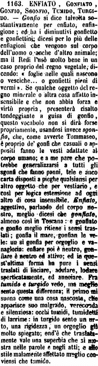 | Enfiato, Gonfiato, Gonfio, Sgonfio, Tumido, Turgido - Gonfio si dice talvolta sostantivamente per enfiato, enfiagione; ed ha i diminutivi gonfietto e gonfiettini; dicesi per lo più delle enfiagioni che vengono sul corpo dell'uomo o anche d'altro animale; ma il Redi l'usò molto bene in un caso proprio del regno vegetale, dicendo: «foglie nelle quali nascono o vesciche... o gonfietti pieni di vermi». Se qualche oggetto del regno minerale o altra cosa affatto insensibile e che non abbia forza e virtù propria, presenterà risalto tondeggiante a guisa di gonfio, questo vocabolo non si dirà forse propriamente, usandosi invece sgonfio, che, come avverte Tommaseo, è proprio de' gonfi che casuali o appositi fanno le vesti adattate al corpo umano; e a me pare che potrebbe generalizzarsi a tutti gli sgonfi che fanno panni, tele e anco carta disposti a pieghe qualsiansi per altro oggetto che per vestiario, e così per logica estensione ad ogni altro di cosa insensibile. Enfiato, aggettivo, parlando del corpo nostro, meglio dicesi che gonfiato, almeno così in Toscana: e gonfiato e gonfio meglio ritiene i sensi traslati; gonfia il mare, gonfian le vele: un si gonfia per orgoglio e vanagloria: enfiare poi è neutro, gonfiare è neutro ed attivo; ed in quest'ultima forma ha pure i sensi traslati di lisciare, adulare, lodare sperticatamente, ed annoiare. Fra tumido e turgido vedo, ma meglio sento questa differenza; il primo mi suona come una cosa nascosta, che apparisce suo malgrado, vereconda e silenziosa: occhi tumidi, tumidetti di lacrime: in turgido sento un urto, una rigidezza, un orgoglio già molto spiegato; ond'è che traslatamente vale una superbia che si mostra nelle parole e negli atti; e allo stile malamente affettato meglio conviensi che tumido. [immagine] |