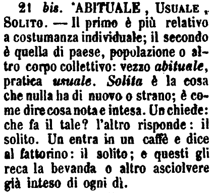 | Abituale, Usuale, Solito - Il primo è più relativo a costumanza individuale; il secondo è quella di paese, popolazione o altro corpo collettivo: vezzo abituale, pratica usuale. Solita è la cosa che nulla ha di nuovo o strano; è come dire cosa nota e intesa. Un chiede: che fa il tale? l'altro risponde: il solito. Un entra in un caffè e dice al fattorino: il solito; e questi gli reca la bevanda o altro asciolvere già inteso di ogni dì. [immagine] |