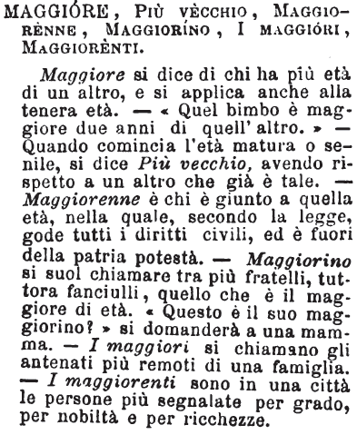 | Maggiore, Più vecchio, Maggiorenne, Maggiorino, I maggiori, Maggiorenti - Maggiore si dice di chi ha più età di un altro, e si applica anche alla tenera età. - «Quel bimbo è maggiore due anni di quell'altro.» - Quando comincia l'età matura o senile, si dice Più vecchio, avendo rispetto a un altro che già è tale. - Maggiorenne è chi è giunto a quella età, nella quale, secondo la legge, gode tutti i diritti civili, ed è fuori della patria podestà. - Maggiorino si suol chiamare tra più fratelli, tuttora fanciulli, quello che è il maggiore di età. «Questo è il suo maggiorino?» si domanderà a una mamma. - I maggiori si chiamano gli antenati più remoti di una famiglia. - I maggiorenti sono in una città le persone più segnalate per grado, per nobiltà e per ricchezze. [immagine] |