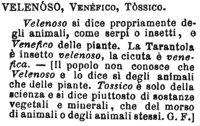 | Velenoso, Venefico, Tossico - Velenoso si dice propriamente degli animali, come serpi o insetti, e Venefico delle piante. La Tarantola è insetto velenoso, la cicuta è venefica. - [Il popolo non conosce che Velenoso e lo dice sì degli animali che delle piante. Tossico è solo della scienza e si dice piuttosto di sostanze vegetali e minerali, che del morso di animali o degli animali stessi. G.F.] [immagine] |